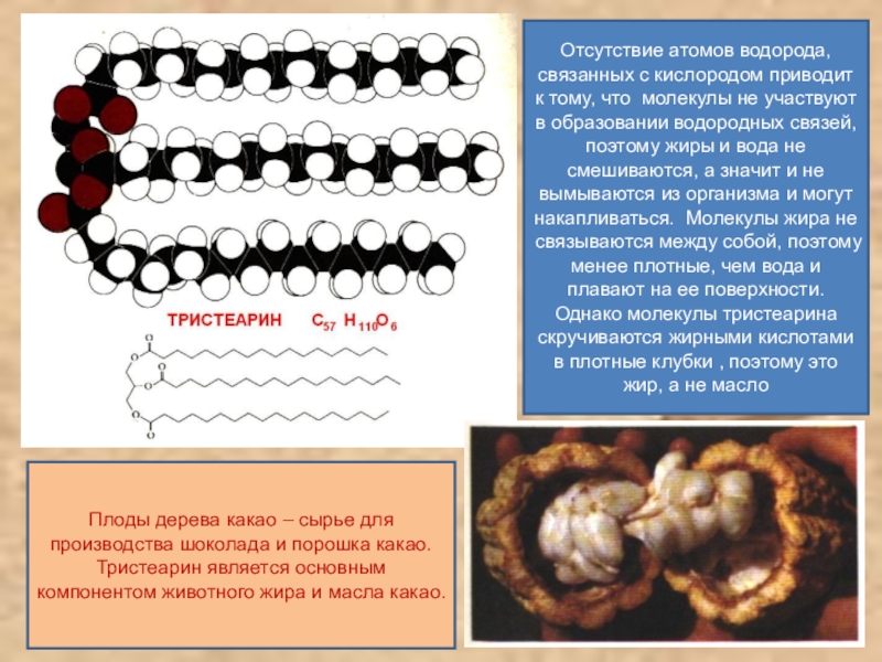 Плоды дерева какао – сырье для производства шоколада и порошка какао. Тристеарин является основным компонентом животного жира и масла какао.