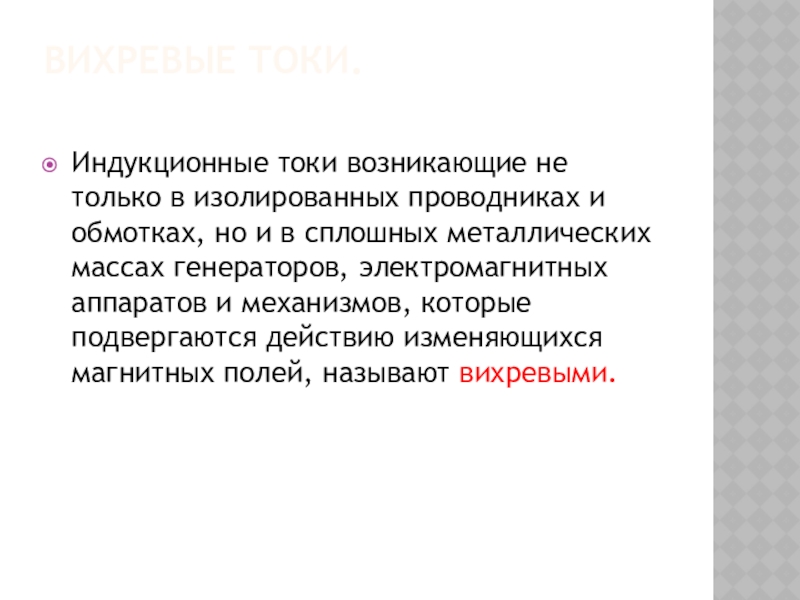 но и в сплошных металлических массах генераторов, электромагнитных аппаратов и механизмов, которые подвергаются действию изменяющихся магнитных полей, называют вихревыми.