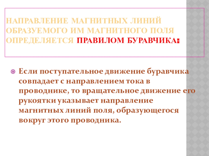 движение буравчика совпадает с направлением тока в проводнике, то вращательное движение его рукоятки указывает направление магнитных линий поля, образующегося вокруг этого проводника.
