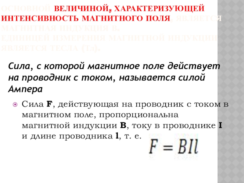 Сила F, действующая на проводник с током в магнитном поле, пропорциональна магнитной индукции В, току в проводнике I и длине проводника l, т. е.