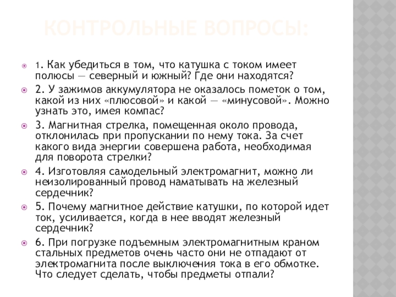 6. При погрузке подъемным электромагнитным краном стальных предметов очень часто они не отпадают от электромагнита после выключения тока в его обмотке. Что следует сделать, чтобы предметы отпали?
