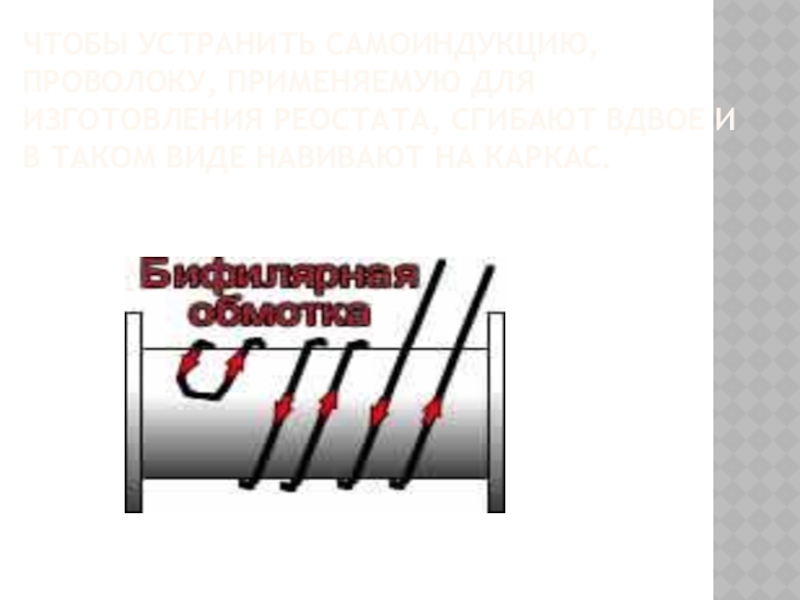 Слайд 53Чтобы устранить самоиндукцию, проволоку, применяемую для изготовления реостата, сгибают вдвое и