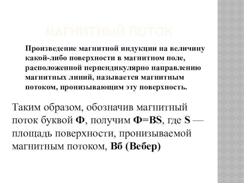 Таким образом, обозначив магнитный поток буквой Ф, получим Ф=ВS, где S — площадь поверхности, пронизываемой магнитным потоком, Вб (Вебер)