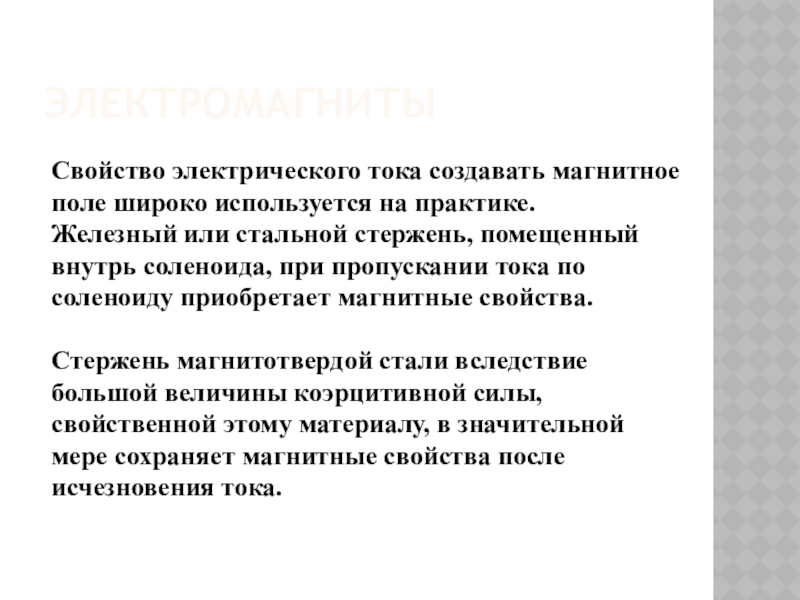 Стержень магнитотвердой стали вследствие большой величины коэрцитивной силы, свойственной этому материалу, в значительной мере сохраняет магнитные свойства после исчезновения тока.