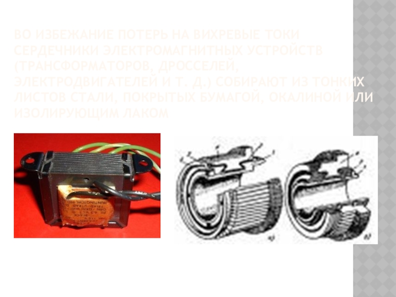 Слайд 50Во избежание потерь на вихревые токи сердечники электромагнитных устройств (трансформаторов, дросселей,