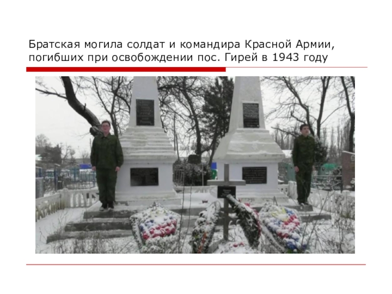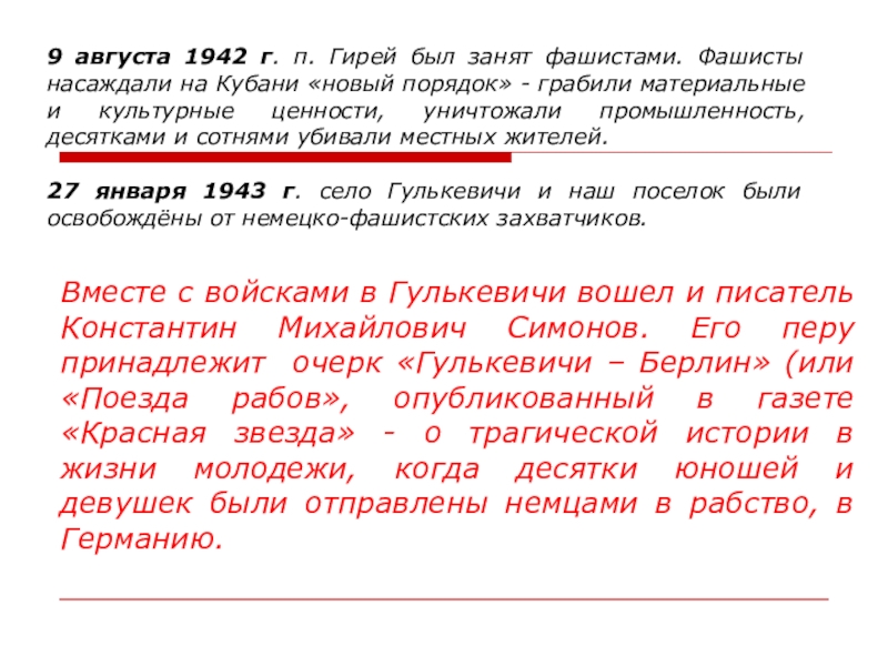 9 августа 1942 г. п. Гирей был занят фашистами. Фашисты насаждали на Кубани «новый порядок» - грабили материальные и культурные ценности, уничтожали промышленность, десятками и сотнями убивали местных жителей.