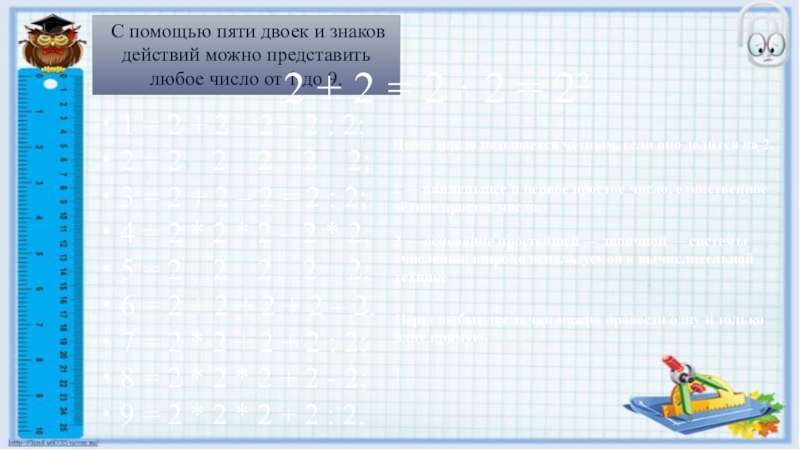 С помощью пяти двоек и знаков действий можно представить любое число от 1 до 9.