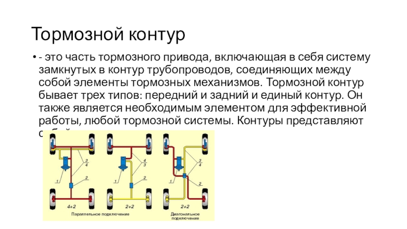 замкнутых в контур трубопроводов, соединяющих между собой элементы тормозных механизмов. Тормозной контур бывает трех типов: передний и задний и единый контур. Он также является необходимым элементом для эффективной работы, любой тормозной системы. Контуры представляют собой диагонали.