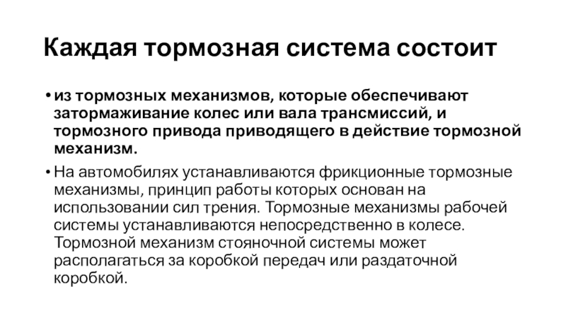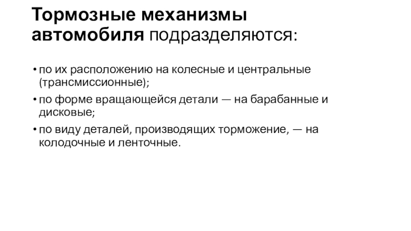 Слайд 13Тормозные механизмы автомобиля подразделяются: