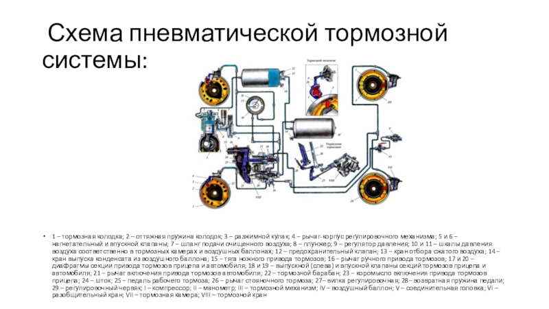 колодок; 3 – разжимной кулак; 4 – рычаг-корпус регулировочного механизма; 5 и 6 – нагнетательный и впускной клапаны; 7 – шланг подачи очищенного воздуха; 8 – плунжер; 9 – регулятор давления; 10 и 11 – шкалы давления воздуха соответственно в тормозных камерах и воздушных баллонах; 12 – предохранительный клапан; 13 – кран отбора сжатого воздуха; 14 – кран выпуска конденсата из воздушного баллона; 15 – тяга ножного привода тормозов; 16 – рычаг ручного привода тормозов; 17 и 20 – диафрагмы секции привода тормозов прицепа и автомобиля; 18 и 19 – выпускной (слева) и впускной клапаны секций тормозов прицепа и автомобиля; 21 – рычаг включения привода тормозов автомобиля; 22 – тормозной барабан; 23 – коромысло включения привода тормозов прицепа; 24 – шток; 25 – педаль рабочего тормоза; 26 – рычаг стояночного тормоза; 27– вилка регулировочная; 28– возвратная пружина педали; 29 – регулировочный червяк; I – компрессор; II – манометр; III – тормозной механизм; IV – воздушный баллон; V – соединительная головка; VI – разобщительный кран; VII – тормозная камера; VIII – тормозной кран