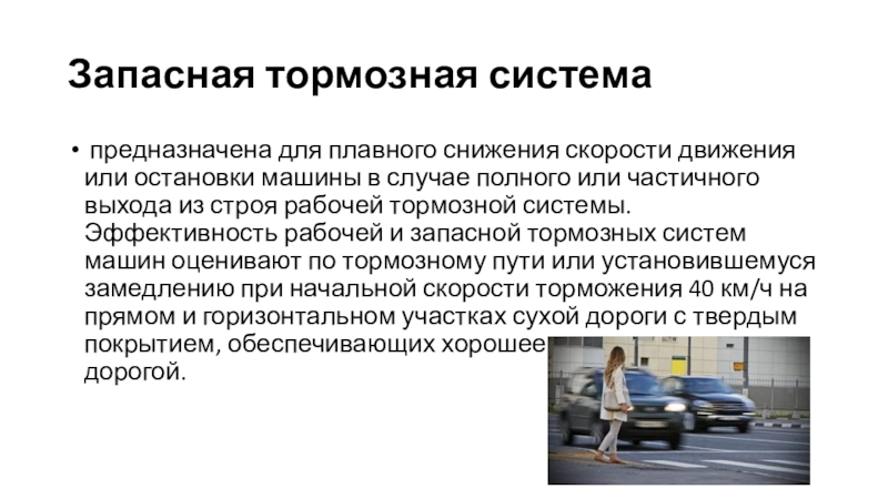 в случае полного или частичного выхода из строя рабочей тормозной системы. Эффективность рабочей и запасной тормозных систем машин оценивают по тормозному пути или установившемуся замедлению при начальной скорости торможения 40 км/ч на прямом и горизонтальном участках сухой дороги с твердым покрытием, обеспечивающих хорошее сцепление колес с дорогой.