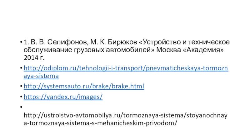 1. В. В. Селифонов, М. К. Бирюков «Устройство и техническое обслуживание
