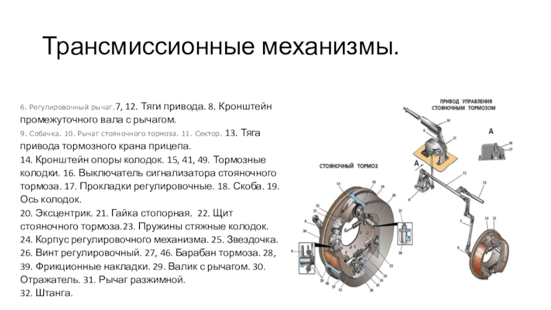 14. Кронштейн опоры колодок. 15, 41, 49. Тормозные колодки. 16. Выключатель сигнализатора стояночного тормоза. 17. Прокладки регулировочные. 18. Скоба. 19. Ось колодок.