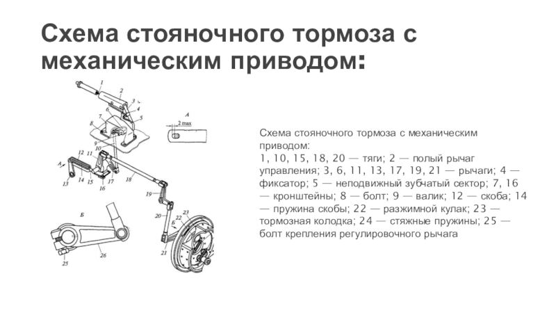 Слайд 9Схема стояночного тормоза с механическим приводом: