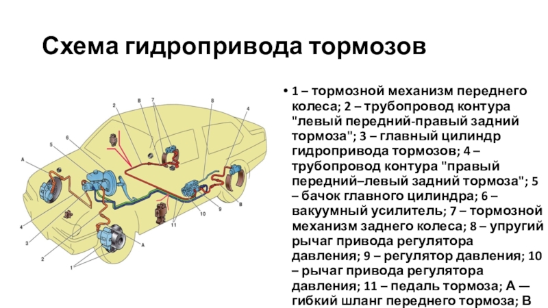 контура "левый передний-правый задний тормоза"; 3 – главный цилиндр гидропривода тормозов; 4 – трубопровод контура "правый передний–левый задний тормоза"; 5 – бачок главного цилиндра; 6 – вакуумный усилитель; 7 – тормозной механизм заднего колеса; 8 – упругий рычаг привода регулятора давления; 9 – регулятор давления; 10 – рычаг привода регулятора давления; 11 – педаль тормоза; А — гибкий шланг переднего тормоза; В — гибкий шланг заднего тормоза