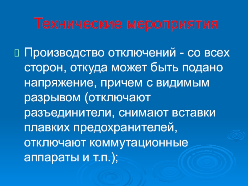 Технические мероприятияПроизводство отключений - со всех сторон, откуда может быть подано напряжение, причем с видимым разрывом (отключают