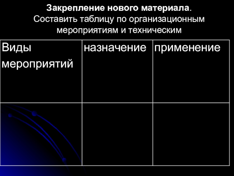 Слайд 10Закрепление нового материала. Составить таблицу по организационным мероприятиям и техническим