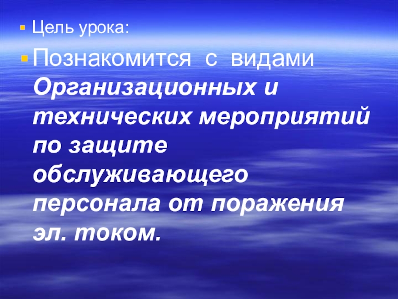 Цель урока: Познакомится с видами Организационных и технических мероприятий по защите обслуживающего персонала от поражения эл. током.