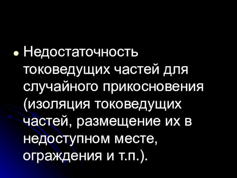 Недостаточность токоведущих частей для случайного прикосновения (изоляция токоведущих частей, размещение их в недоступном месте, ограждения и т.п.).