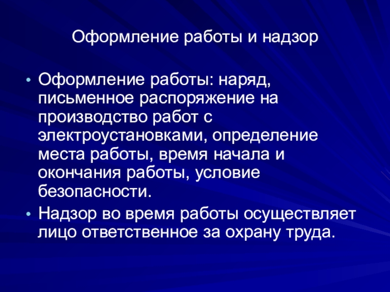 Оформление работы и надзорОформление работы: наряд, письменное распоряжение на производство работ с электроустановками, определение места работы, время