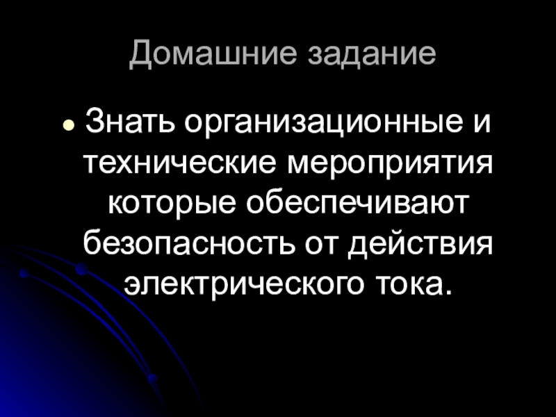 Домашние заданиеЗнать организационные и технические мероприятия которые обеспечивают безопасность от действия электрического тока.