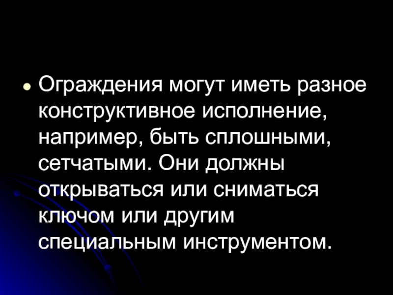 Ограждения могут иметь разное конструктивное исполнение, например, быть сплошными, сетчатыми. Они должны открываться или сниматься ключом или
