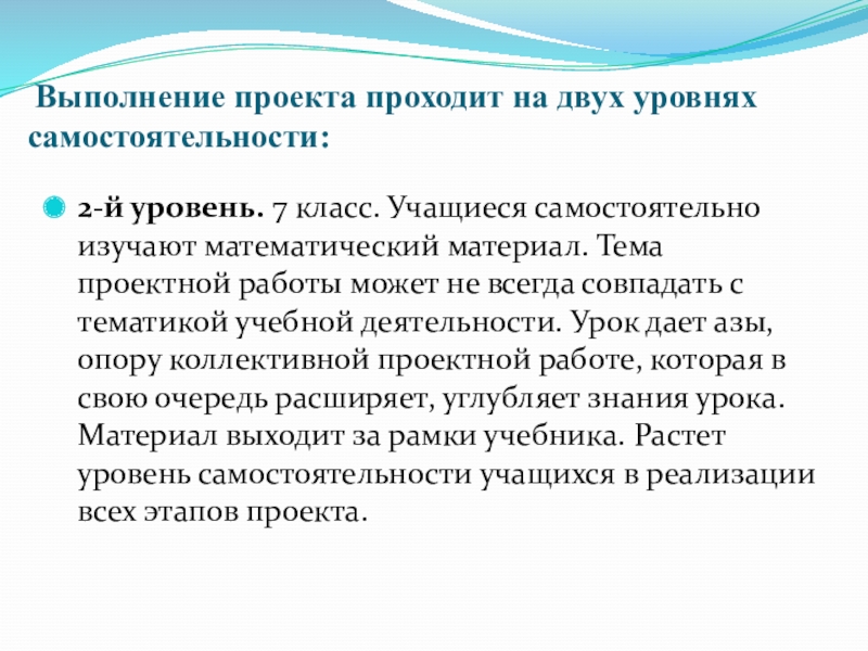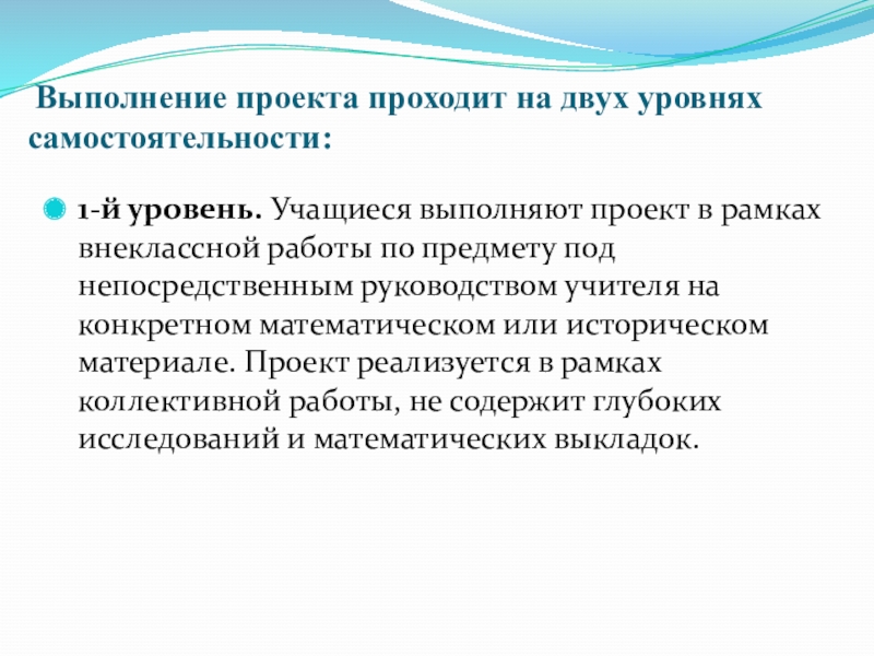 Выполнение проекта проходит на двух уровнях самостоятельности: