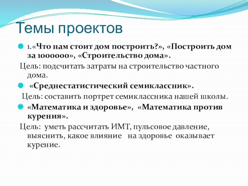 проект в рамках внеклассной работы по предмету под непосредственным руководством учителя на конкретном математическом или историческом материале. Проект реализуется в рамках коллективной работы, не содержит глубоких исследований и математических выкладок.