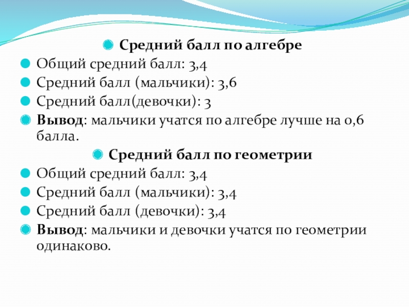 Вывод: мальчики и девочки учатся по геометрии одинаково.