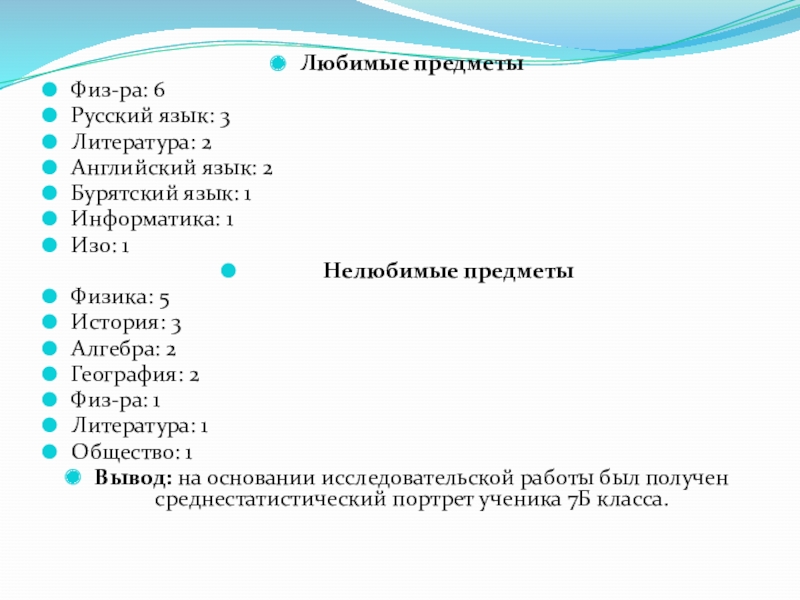 Вывод: на основании исследовательской работы был получен среднестатистический портрет ученика 7Б класса.