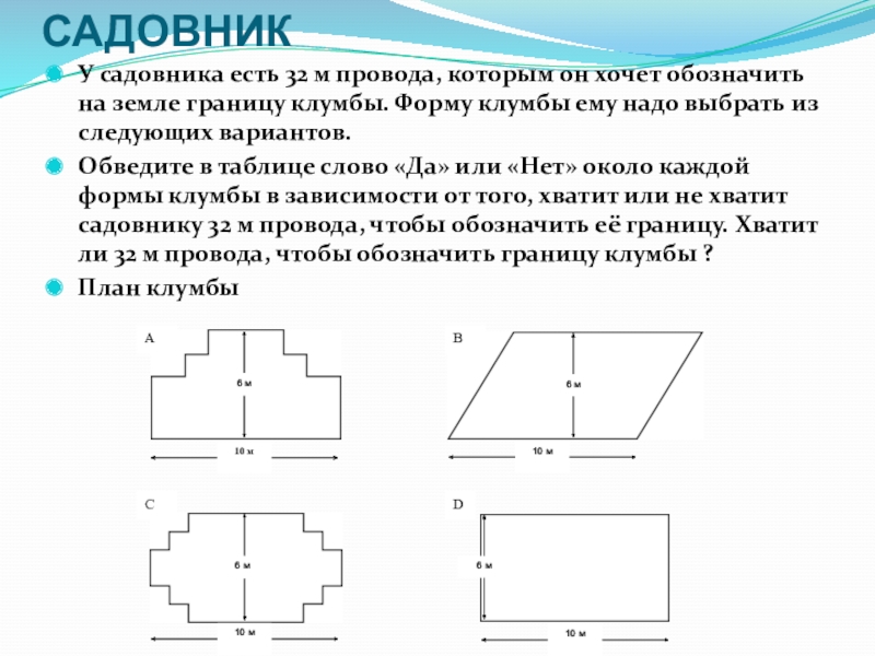 Обведите в таблице слово «Да» или «Нет» около каждой формы клумбы в зависимости от того, хватит или не хватит садовнику 32 м провода, чтобы обозначить её границу. Хватит ли 32 м провода, чтобы обозначить границу клумбы ?