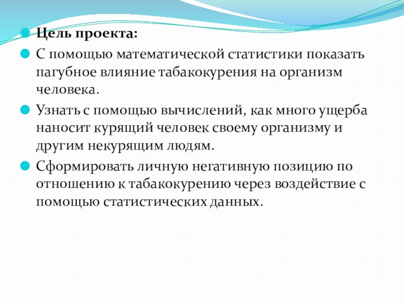 Сформировать личную негативную позицию по отношению к табакокурению через воздействие с помощью статистических данных.