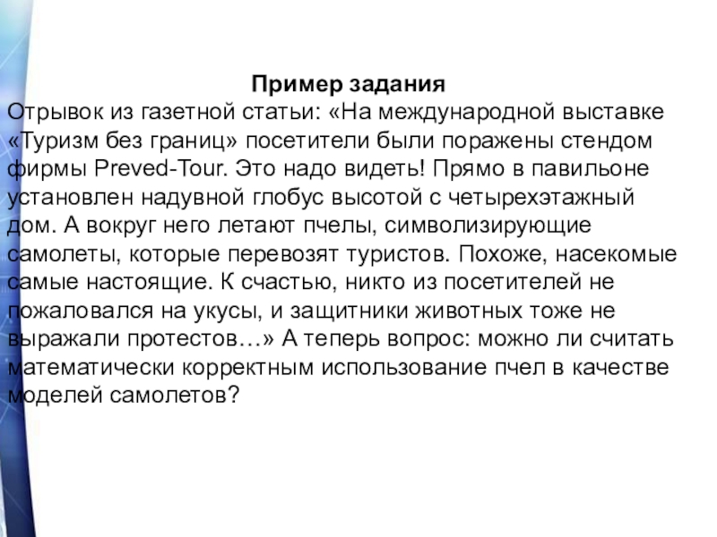 посетители были поражены стендом фирмы Preved-Tour. Это надо видеть! Прямо в павильоне установлен надувной глобус высотой с четырехэтажный дом. А вокруг него летают пчелы, символизирующие самолеты, которые перевозят туристов. Похоже, насекомые самые настоящие. К счастью, никто из посетителей не пожаловался на укусы, и защитники животных тоже не выражали протестов…» А теперь вопрос: можно ли считать математически корректным использование пчел в качестве моделей самолетов?
