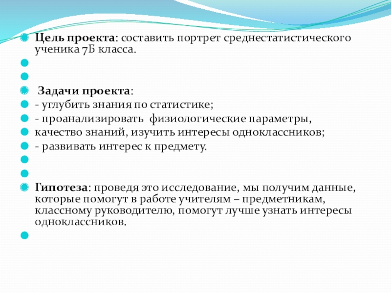 Слайд 16Цель проекта: составить портрет среднестатистического ученика 7Б класса.