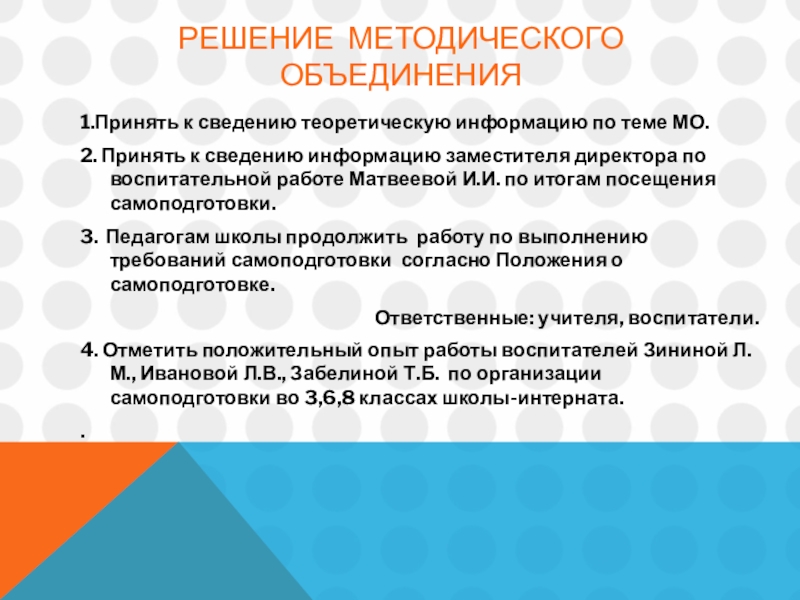 4. Отметить положительный опыт работы воспитателей Зининой Л.М., Ивановой Л.В., Забелиной Т.Б. по организации самоподготовки во 3,6,8 классах школы-интерната.