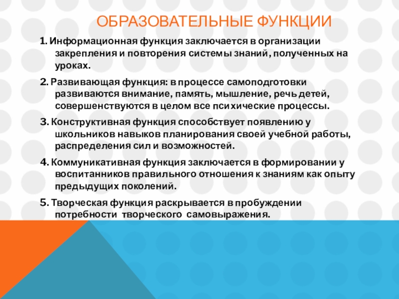 2. Развивающая функция: в процессе самоподготовки развиваются внимание, память, мышление, речь детей, совершенствуются в целом все психические процессы.