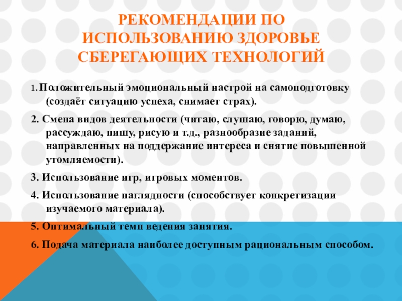 РЕКОМЕНДАЦИИ ПО ИСПОЛЬЗОВАНИЮ ЗДОРОВЬЕ СБЕРЕГАЮЩИХ ТЕХНОЛОГИЙ