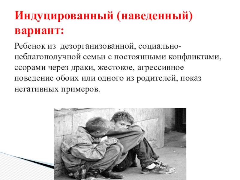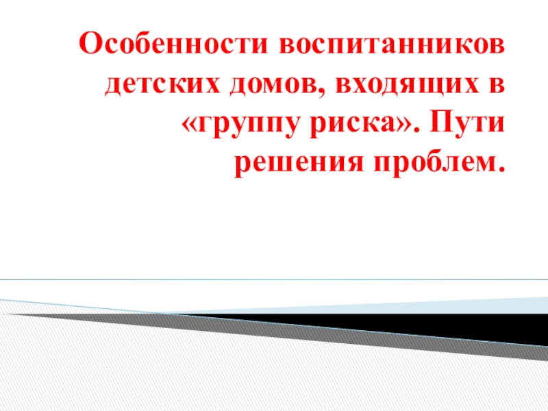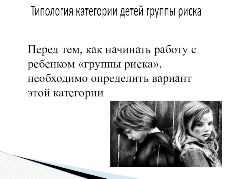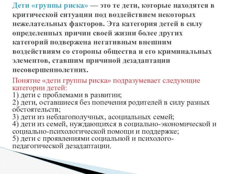 Дети «группы риска» — это те дети, которые находятся в критической ситуации под воздействием некоторых нежелательных факторов. Эта категория детей в силу определенных причин своей жизни более других категорий подвержена негативным внешним воздействиям со стороны общества и его криминальных элементов, ставшим причиной дезадаптации несовершеннолетних.