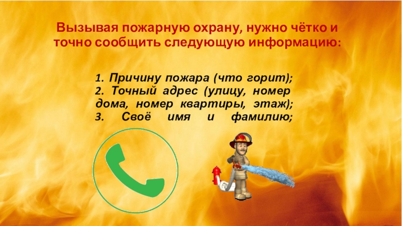 Вызывая пожарную охрану, нужно чётко и точно сообщить следующую информацию:
