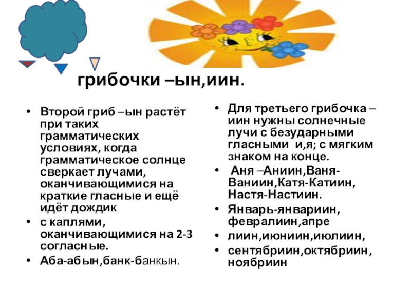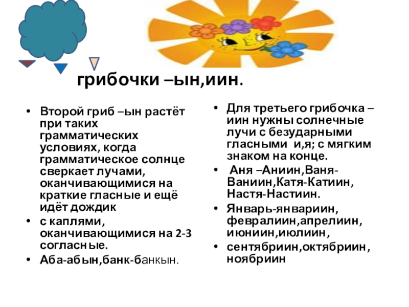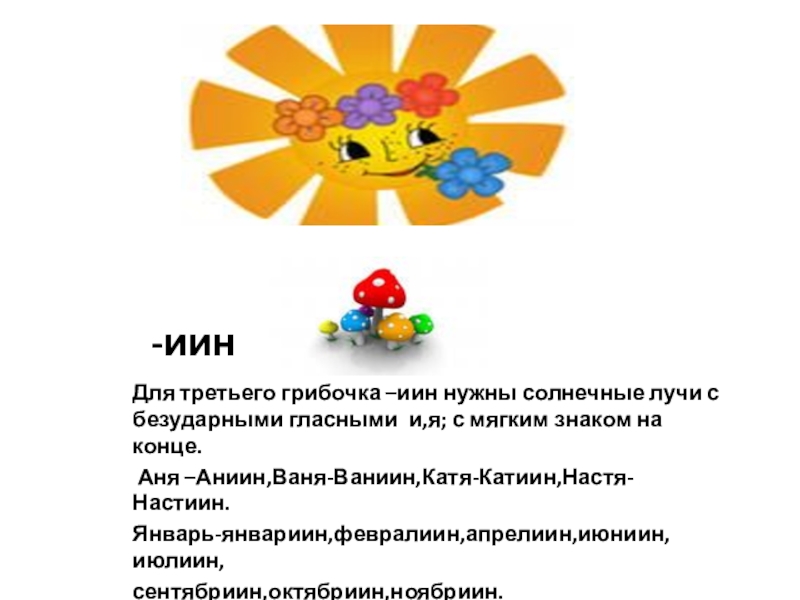 Для третьего грибочка –иин нужны солнечные лучи с безударными гласными и,я; с мягким знаком на конце.