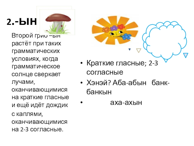 Второй гриб –ын растёт при таких грамматических условиях, когда грамматическое солнце сверкает лучами, оканчивающимися на краткие гласные и ещё идёт дождик