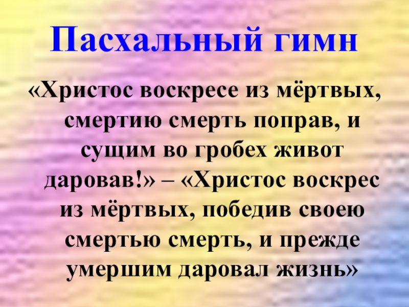 гробех живот даровав!» – «Христос воскрес из мёртвых, победив своею смертью смерть, и прежде умершим даровал жизнь»