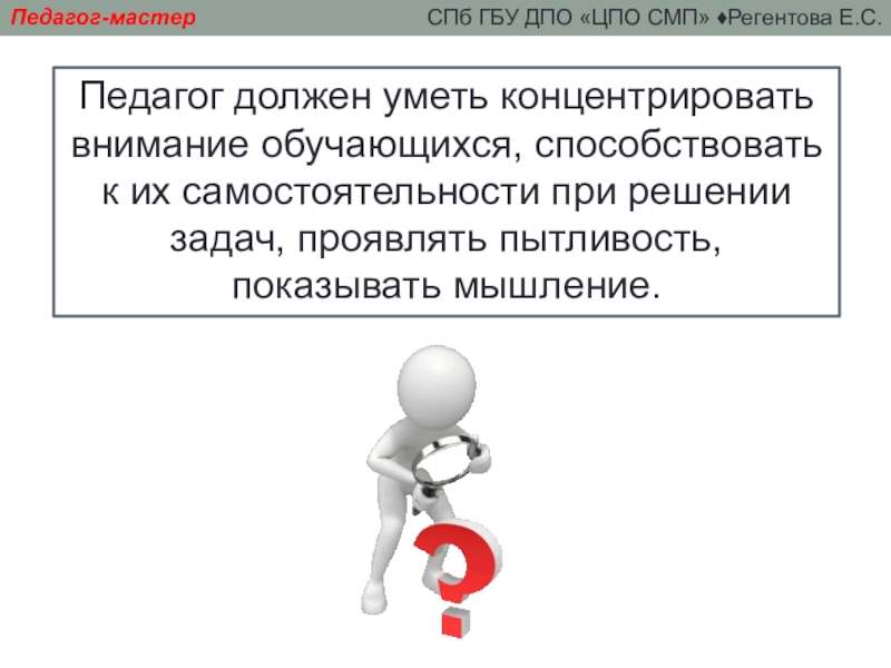 должен уметь управлять процессом образования, иметь необходимые знания, активно развивать у обучающихся умение освоения полученным материалом.
