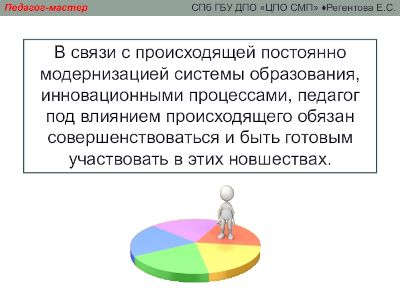 модернизацией системы образования, инновационными процессами, педагог под влиянием происходящего обязан совершенствоваться и быть готовым участвовать в этих новшествах.