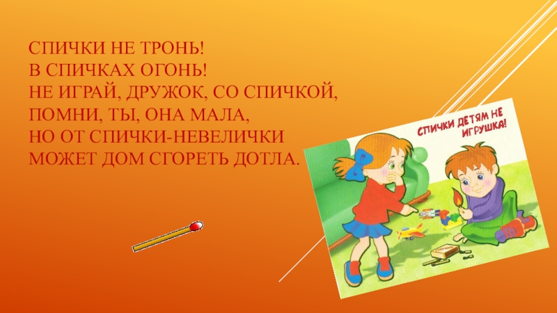 Слайд 5  Спички не тронь! В спичках огонь! Не играй, дружок, со спичкой, Помни, ты, она