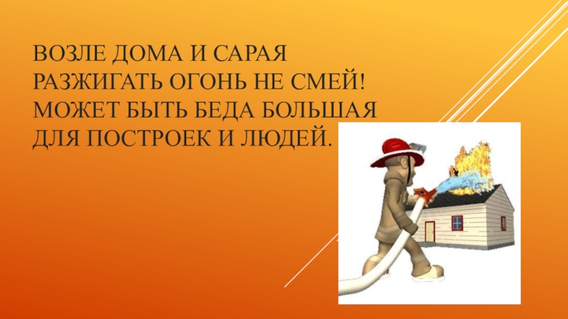 Слайд 7Возле дома и сарая Разжигать огонь не смей! Может быть беда большая Для построек