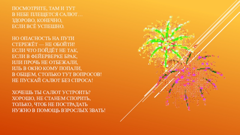 Слайд 10Посмотрите, там и тут В небе плещется салют… Здорово, конечно, Если всё успешно. Но опасность