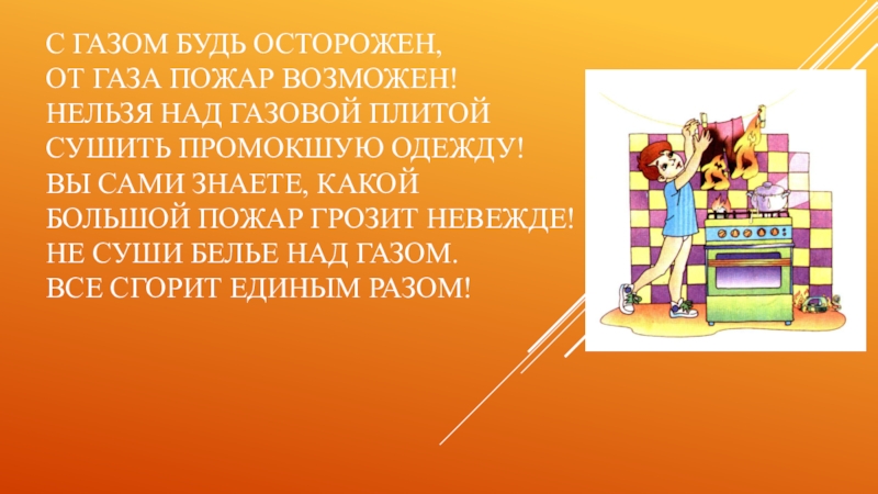 С газом будь осторожен, От газа пожар возможен! Нельзя над газовой плитой Сушить промокшую одежду! Вы сами