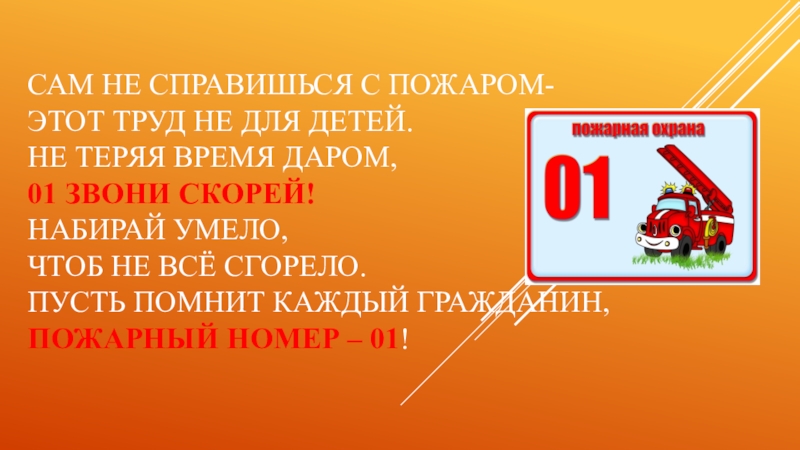 Сам не справишься с пожаром- Этот труд не для детей. Не теряя время даром, 01 звони скорей!