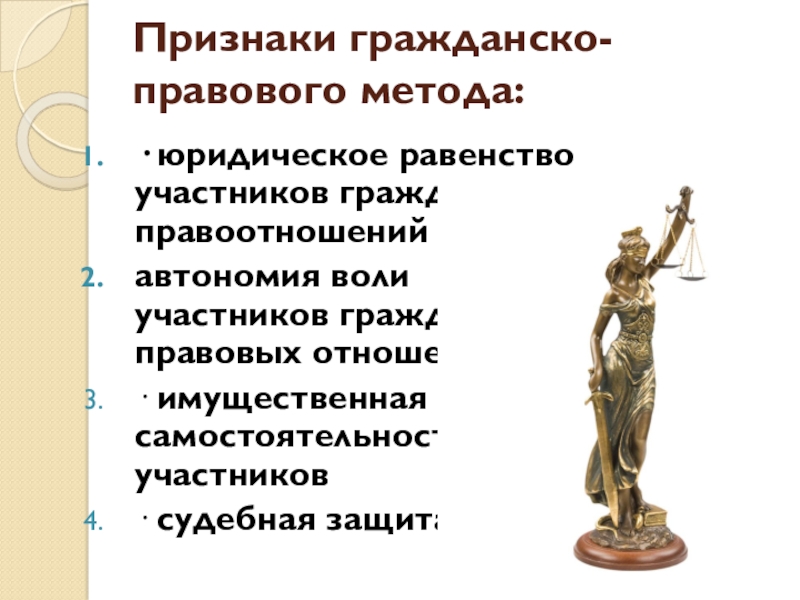 Признаки гражданско-правового метода: · юридическое равенство участников гражданских правоотношенийавтономия воли участников гражданско-правовых отношений· имущественная самостоятельность участников· судебная защита